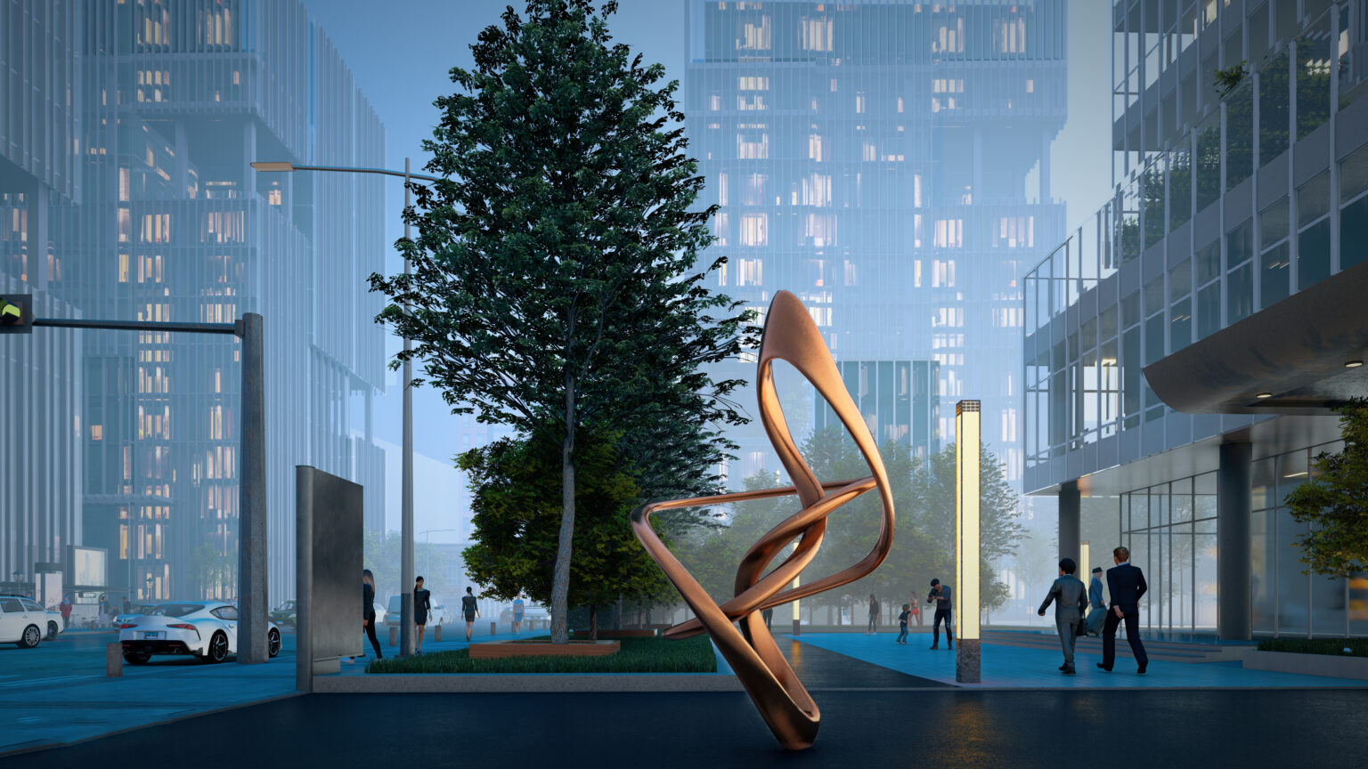 A symphony of movement, frozen in time, this fluidic public art weaves the rhythm of the city into each curve. It whispers a story of motion, where architecture and emotion collide, shaping a space that breathes, dances, and awakens the senses. More than a structure, it is a moment captured—an echo of the unseen forces that shape our world.