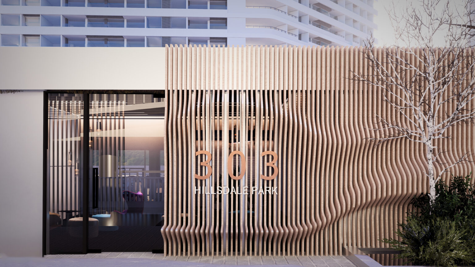 The entrance design of Hillsdale Park features a seamless blend of natural materials and modern aesthetics. The curved wooden wall adds warmth and fluidity, while the minimalist glass and metal framework enhances transparency and openness. The bold, sculptural signage integrates with the space, acting both as a wayfinding element and a statement of identity. The design invites movement, guiding visitors effortlessly into the commercial interior.