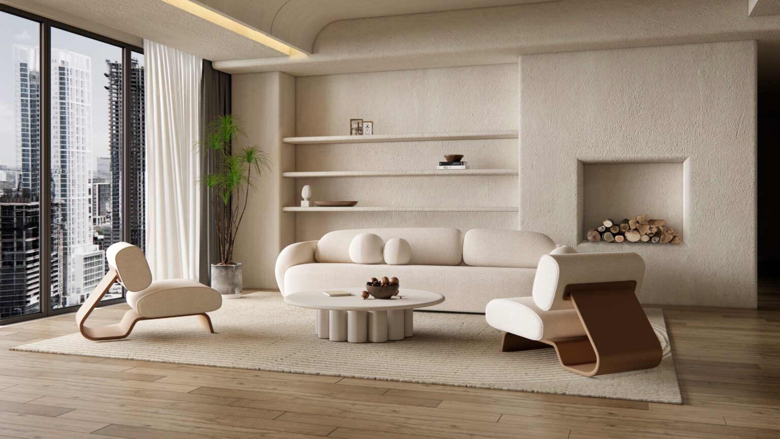 Serene Spaces is a high-end interior design project that embodies sophistication through minimalist aesthetics and warm, earthy tones. Designed for modern urban living, this space seamlessly blends organic textures, soft neutral palettes, and contemporary furniture to create a tranquil yet inviting atmosphere. With floor-to-ceiling windows offering a panoramic city view, custom-built shelving, and sculptural seating, the design harmonizes luxury with comfort. Every element has been carefully curated to evoke a sense of calm and refinement, making this project a true masterpiece of modern interior elegance.